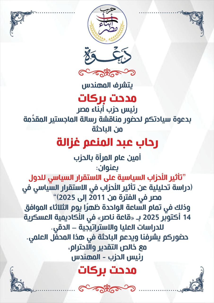 وجَّه المهندس مدحت بركات، رئيس حزب أبناء مصر، دعوة عامة لحضور مناقشة رسالة الماجستير المقدَّمة من رحاب عبد المنعم غزالة، أمين عام المرأة بالحزب، تحت عنوان "تأثير الأحزاب السياسية على الاستقرار السياسي للدول – دراسة تحليلية عن تأثير الأحزاب في الاستقرار السياسي في مصر خلال الفترة من 2011 إلى 2025".