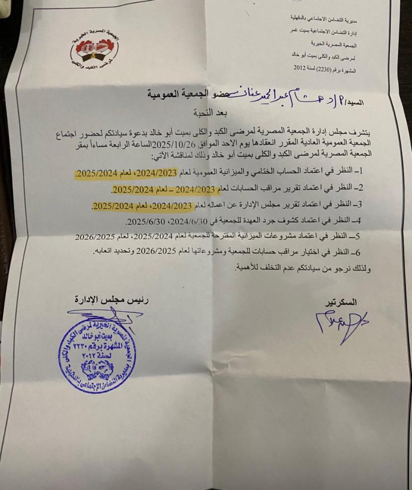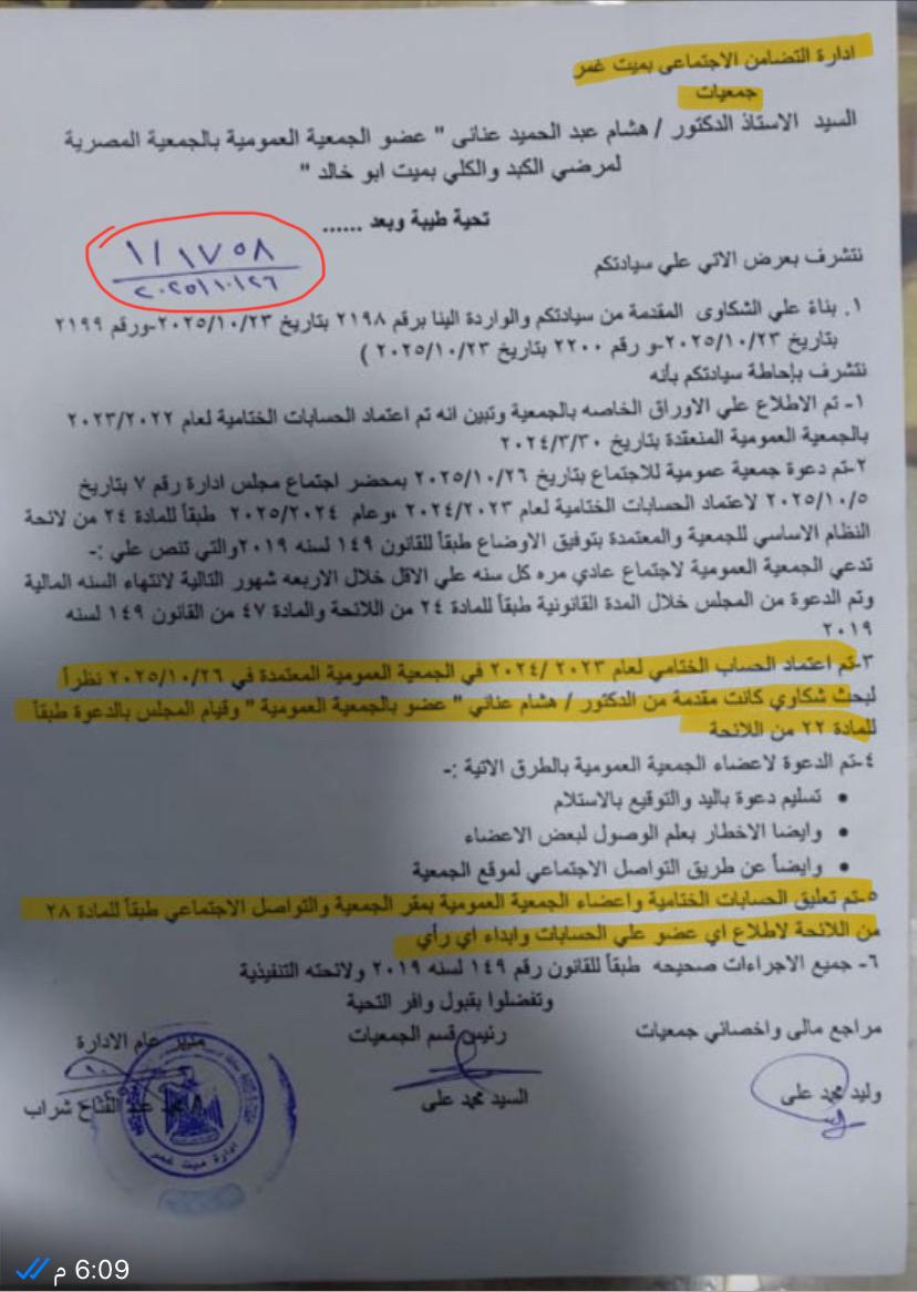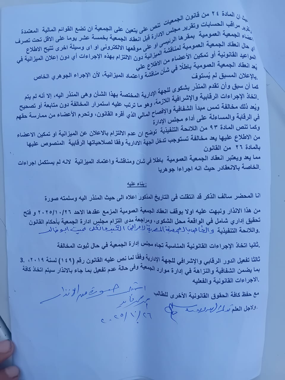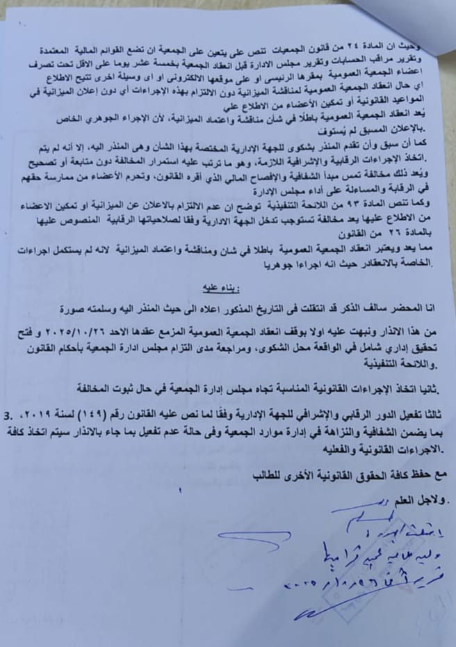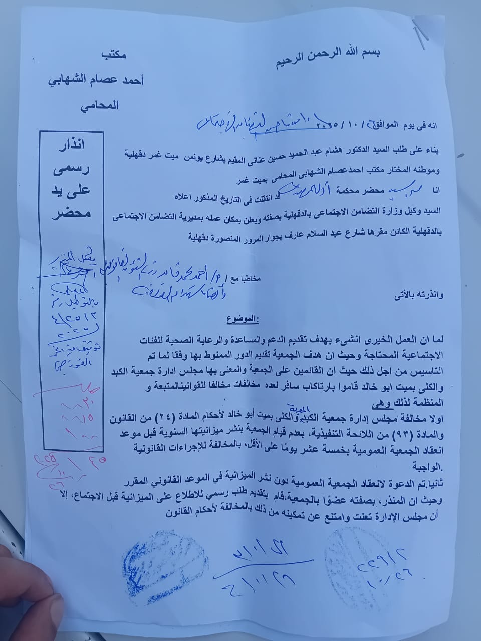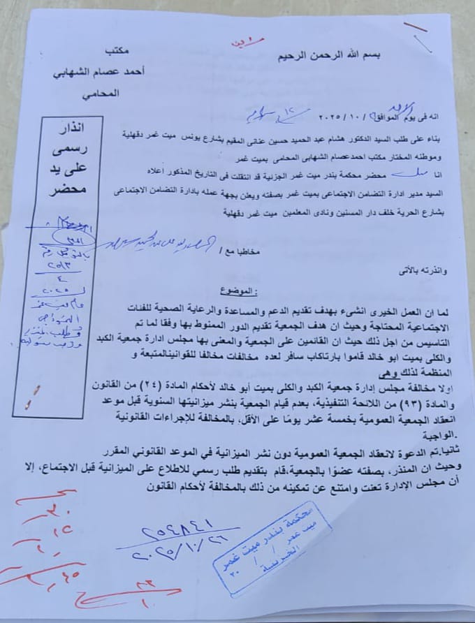 حيث تم إرسال شكاوى وإنذارات على يد محضر إلى إدارة التضامن بميت غمر ومديرية التضامن بالدقهلية، للتحذير من انعقاد الجمعية العمومية للجمعية لاعتماد الحسابات الختامية للجمعية عن أعوام 2023/2024/2025، حيث إن إجراءات انعقاد الجمعية مخالفة للقانون حسبما ورد في الإنذار، وتهدد مبدأ الشفافية الذي تنادي به الدولة.