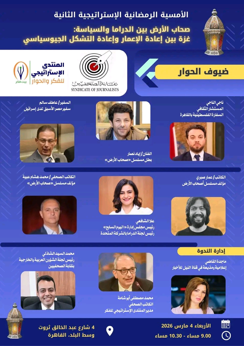 تنظم لجنة الشئون العربية والخارجية بنقابة الصحفيين، برئاسة محمد السيد الشاذلي، بالتعاون مع المنتدى الاستراتيجي للفكر والحوار، الأمسية الرمضانية الاستراتيجية الثانية تحت عنوان: «صحاب الأرض بين الدراما والسياسة.. وغزة بين إعادة الإعمار وإعادة التشكل الجيوسياسي»، وذلك يوم الأربعاء 4 مارس 2026م، في تمام الساعة التاسعة مساءً، بقاعة أمين الرافعي في مقر النقابة.